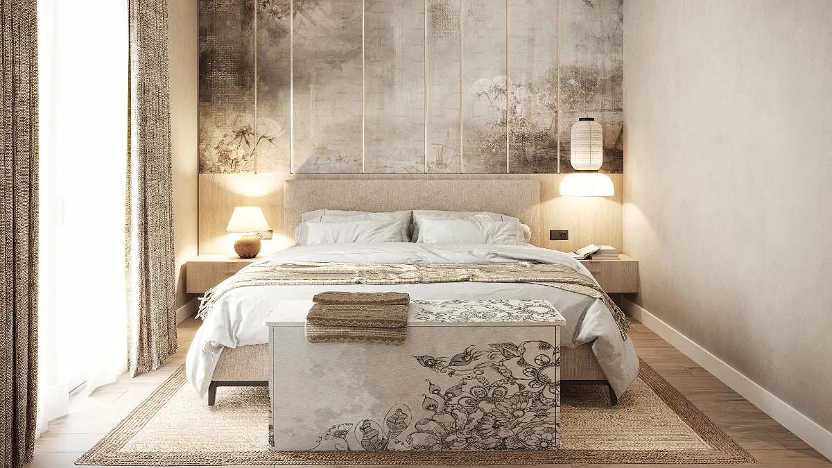 Spavaće sobe razvijene su kao intimniji sloj enterijera, svaka sa svojim karakterom, ali unutar istog mirnog i usklađenog jezika. Master soba oblikovana je kroz meke tonove, prirodne teksture, svijetlo drvo i suzdržane dekorativne akcente, stvarajući prostor odmora i unutrašnje tišine. Dječije sobe donose nešto razigraniji izraz kroz zidne ilustracije i nježne kolorističke pomake, ali i dalje ostaju u skladu sa cjelokupnim konceptom stana. Na taj način enterijer uspijeva da bude istovremeno elegantan i porodičan, sofisticiran i topao.
